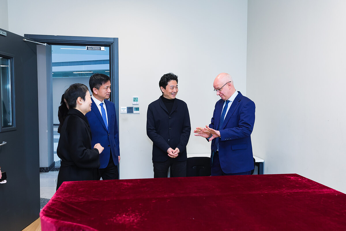 不仅如此,吕思清校长向魏磊大使介绍了学校吸引了来自世界各地的音乐家、教育家来到青岛,共同组建起强大的国际化教学团队阵容,这让魏磊大使更加赞赏,他特别关注到其中包括了一批来自于英国以及在英国留学归来的教师,并与英国教师David Colin Regan亲切交流。