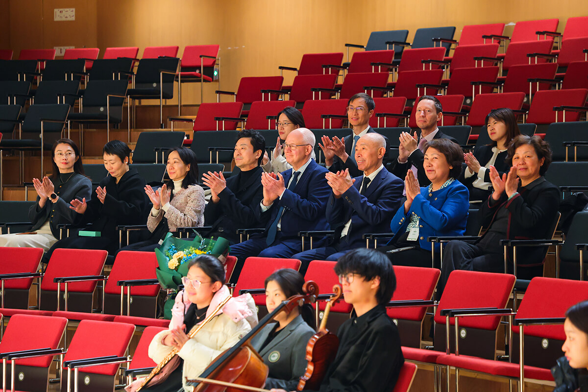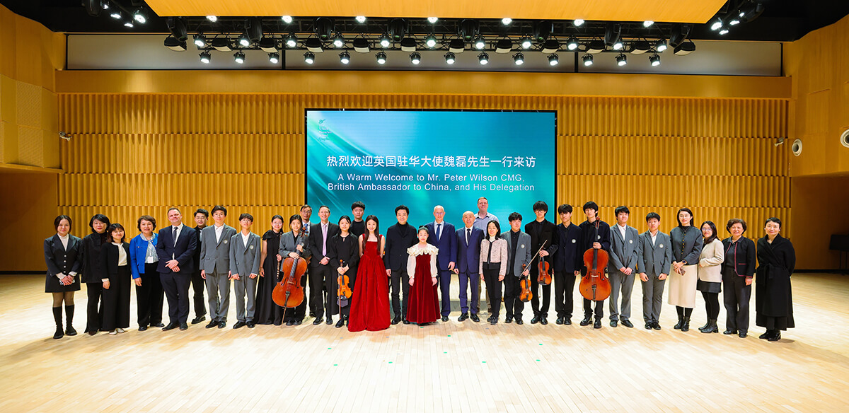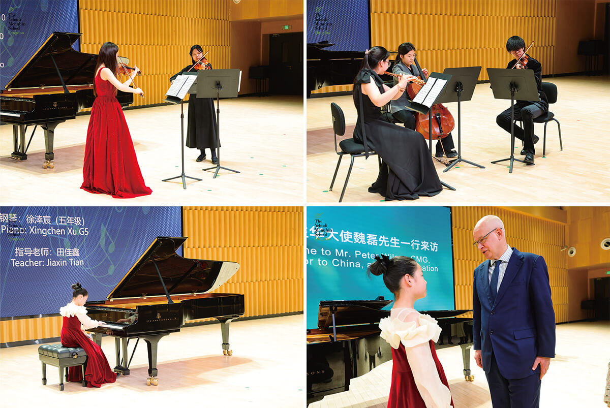 魏磊大使一行还愉快地欣赏了学生们的精彩演出,对同学们的演奏赞誉有加,在演出后与同学们一一握手合影,并亲切询问了他们的学习情况、兴趣爱好和未来志向。魏磊大使表示,看到这样一所学校在中国的蓬勃发展、不断培养出走向世界的青年音乐家,不仅给中国的青少年音乐教育带来宝贵的国际化资源,更重要的是成为了中英两国文化交流和友好往来的重要亲历者和推动者,令人非常激动,英国驻华大使馆非常愿意继续支持青岛耶胡迪梅纽因学校在各领域不断拓展出新的成果。