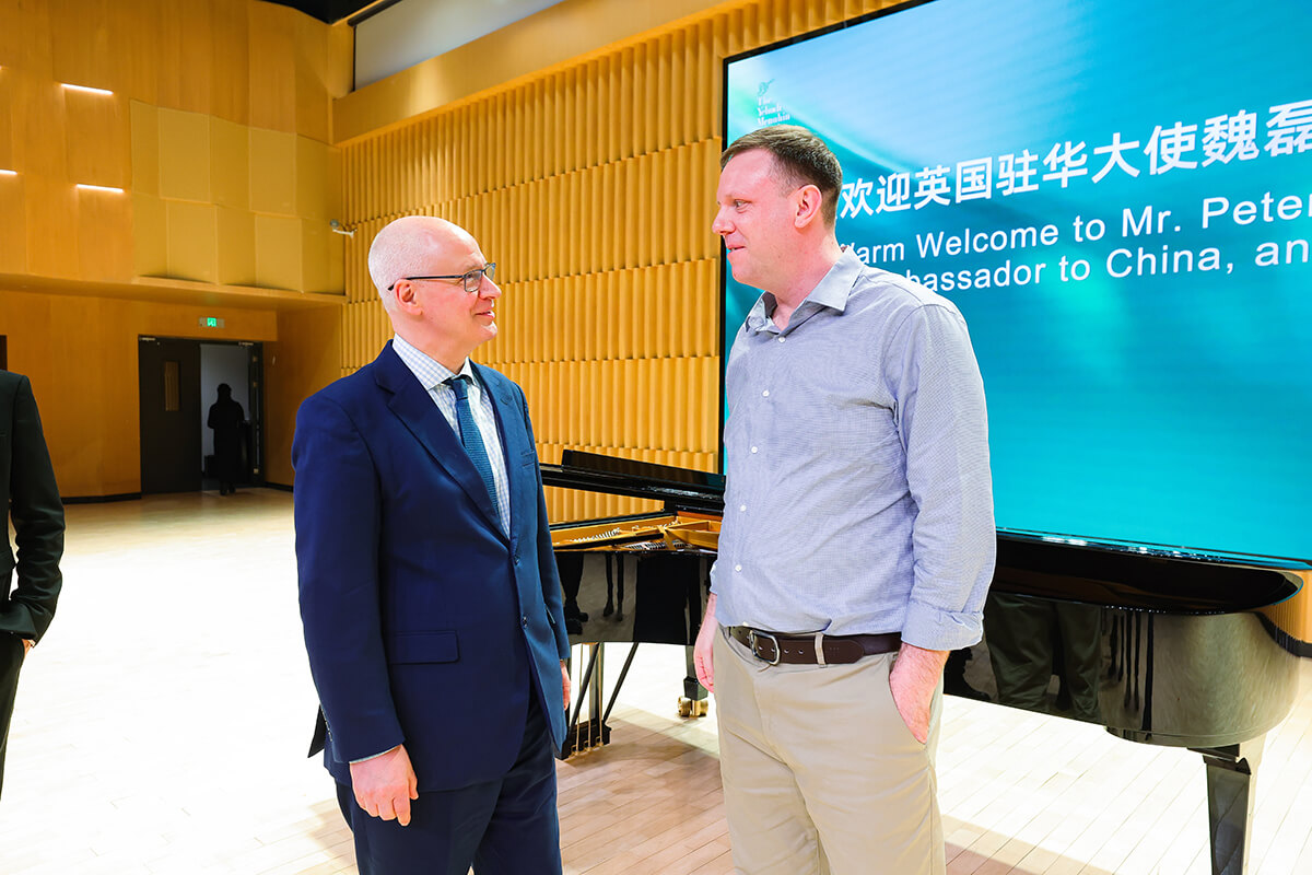 不仅如此,吕思清校长向魏磊大使介绍了学校吸引了来自世界各地的音乐家、教育家来到青岛,共同组建起强大的国际化教学团队阵容,这让魏磊大使更加赞赏,他特别关注到其中包括了一批来自于英国以及在英国留学归来的教师,并与英国教师David Colin Regan亲切交流。